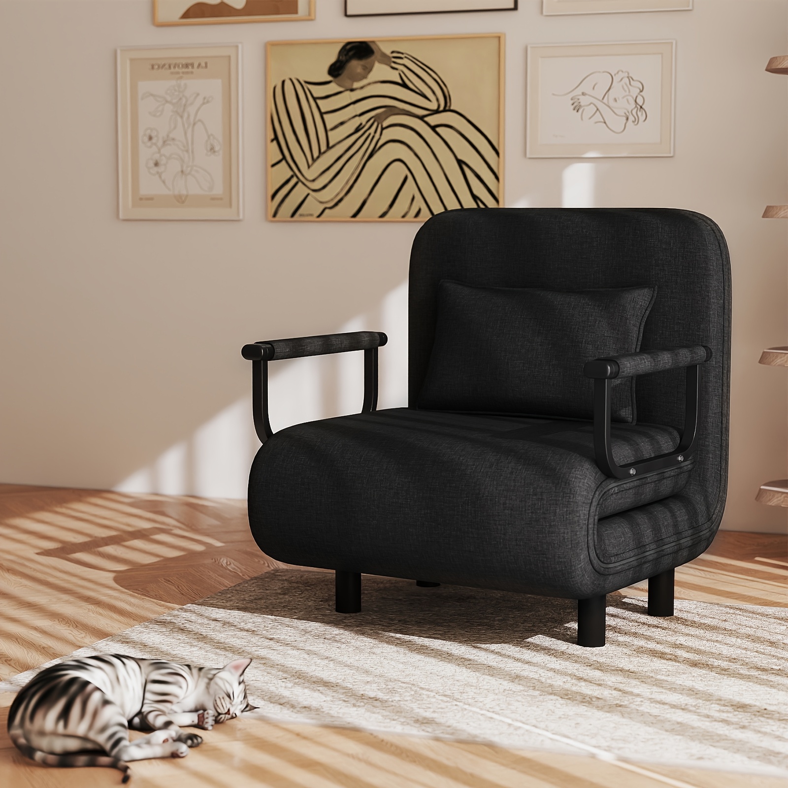"Le fauteuil convertible sert de coin lecture le jour et de lit d’appoint le soir. Solide, confortable, et ça se range sans effort."