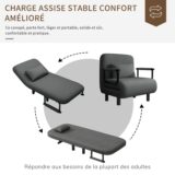 Grâce à son dossier réglable et à sa conception pliable, ce fauteuil s’adapte à différentes situations. Il peut servir de fauteuil de détente, de méridienne ou de couchage confortable pour une nuit occasionnelle.