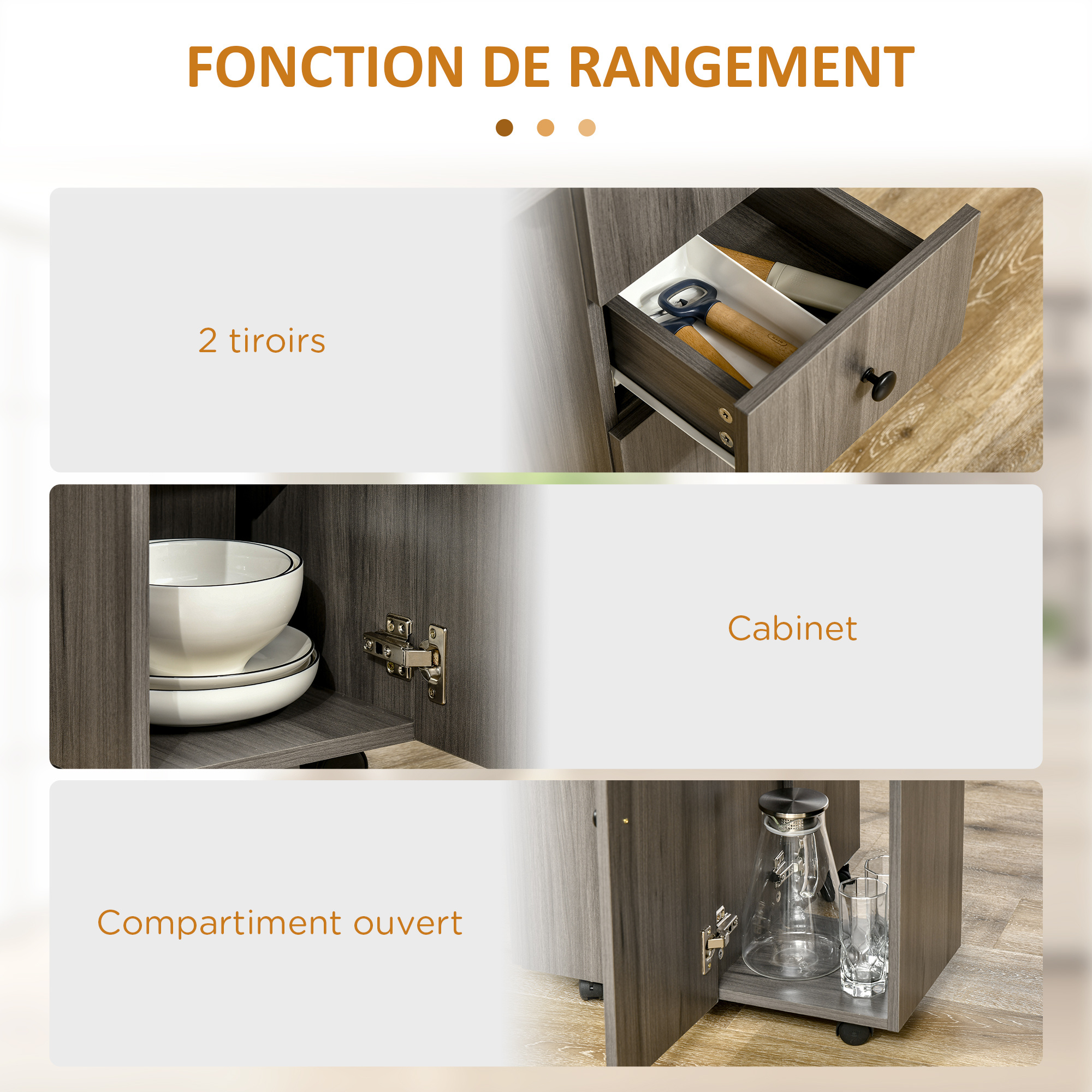 - Rangements intégrés fonctionnels : 2 tiroirs, 1 placard et 1 étagère