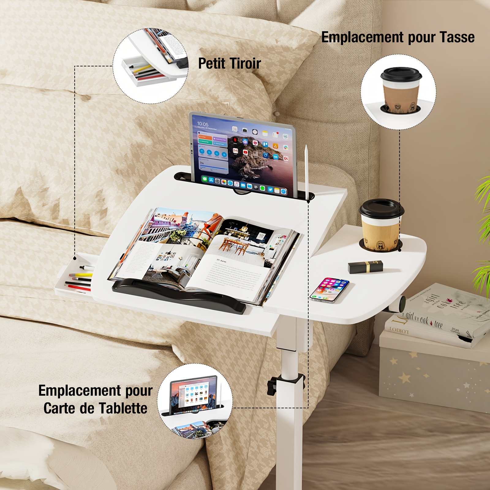 - Plateau de 60 × 40 cm environ, adapté aux ordinateurs portables