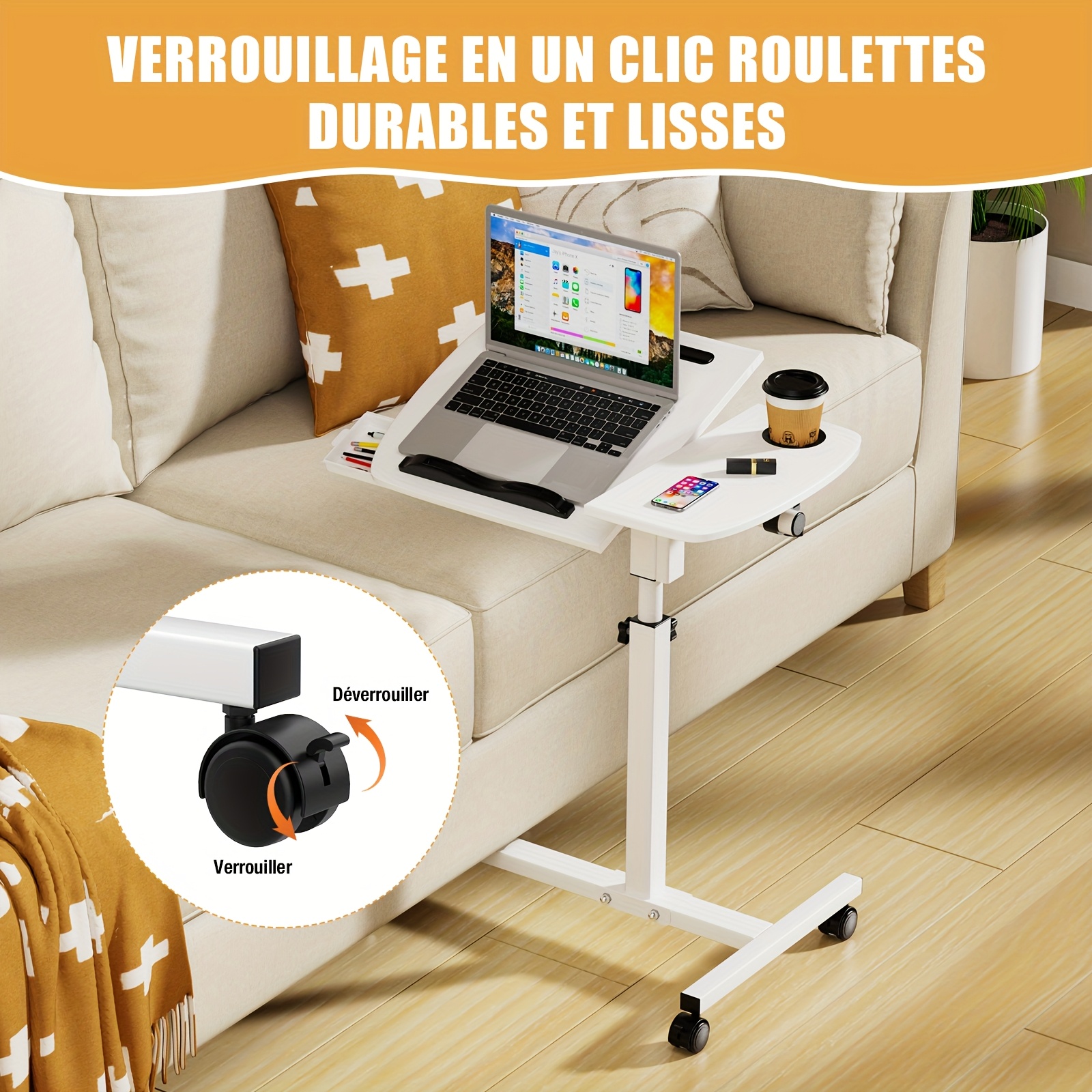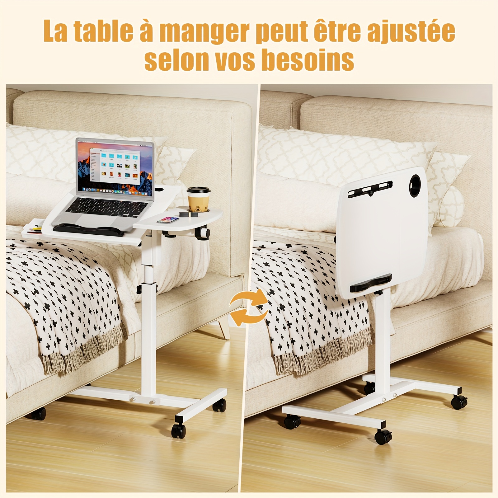 La table réglable pour ordinateur portable permet de créer un poste de travail mobile sans installer de bureau fixe. Elle s’utilise aussi bien dans un salon que dans une chambre et se déplace facilement grâce à ses roulettes, ce qui la rend parfaitement adaptée aux petits espaces.